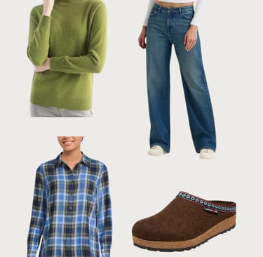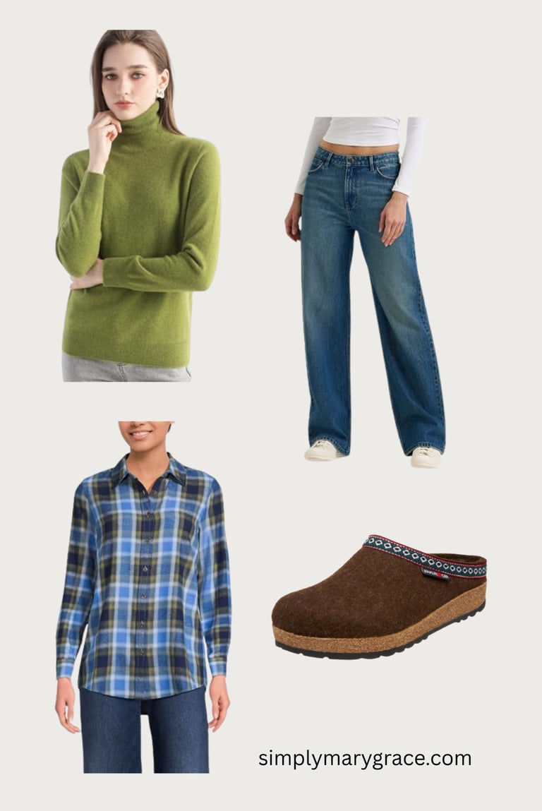 You don’t have to start from scratch to bring a little farmhouse charm into your look. Try easy layers — a plaid flannel over a white tank, or a cozy cardigan paired with jeans and boots. Stick with soft, earthy colors like sage, oatmeal, and faded blue. They go with everything and instantly calm down your outfit.